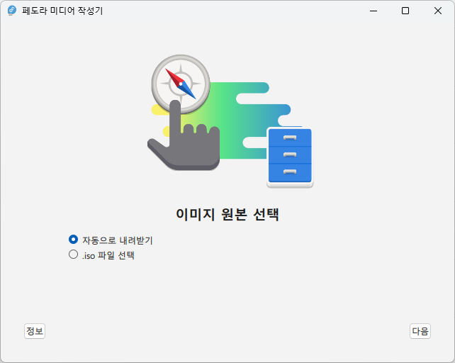 Fedora 부팅 USB 만드는 방법 Fedora 부팅 USB 만드는 방법페도라 미디어 작성기1. 이미지 원본 선택1-1. 자동으로 내려받기[참고]Fedora Media Writer 버전 : 5.3.12. 페도라 출시 선택2-1. 공식 배포판: Fedora Workstation2-2. 공식 배포판: Fedora KDE Plasma Desktop3. 작성 옵션3-1. 버전: 433-2. 하드웨어 구조: 인텔/AMD 64비트3-3. USB 드라이브: 8GB 이상 USB 소프트웨어/FedoraMediaWriter 17:28:29