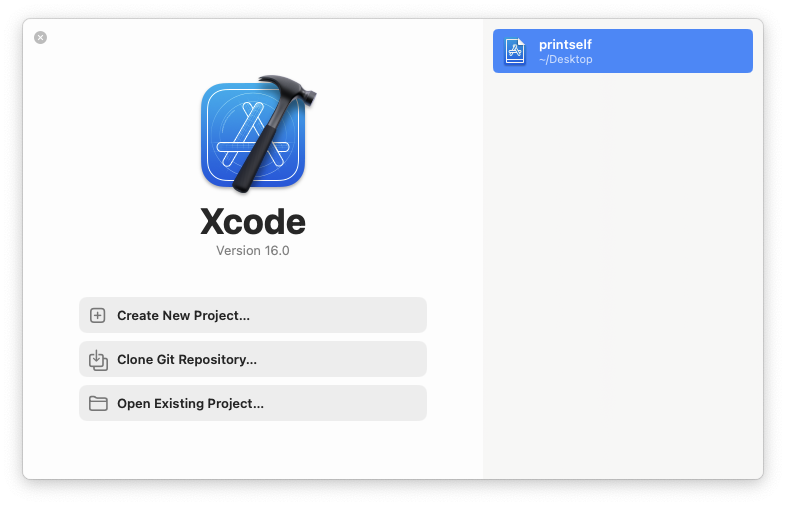 Xcode 실행하고 초기화면에서 새 프로젝트 생성(Create New Projet), Git 저장소 복제(Clone Git Repository), 기존 프로젝트 열기(Open Existing Project) 중에 선택가능하며 우측에 최근 작업한 프로젝트가 표시된다.