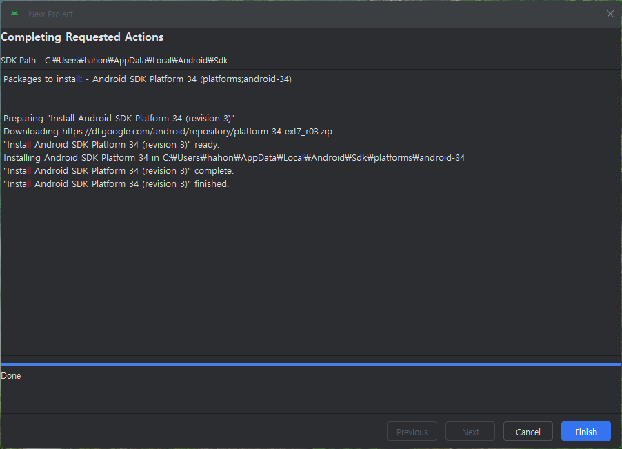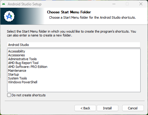안드로이드 스튜디오 시작 폴더 생성할 것인지 선택하고 [Install] 버튼을 클릭해서 설치를 진행한다.