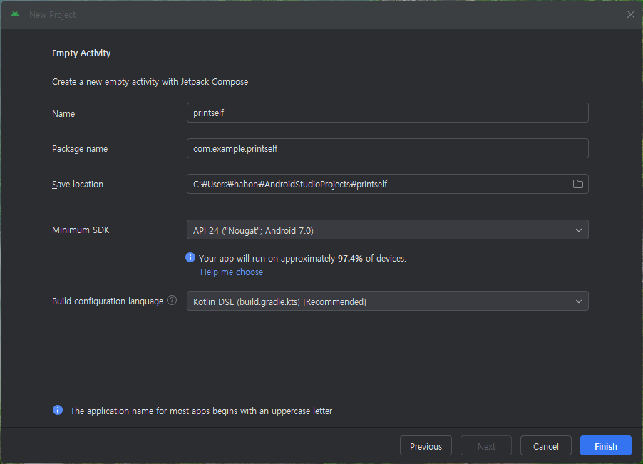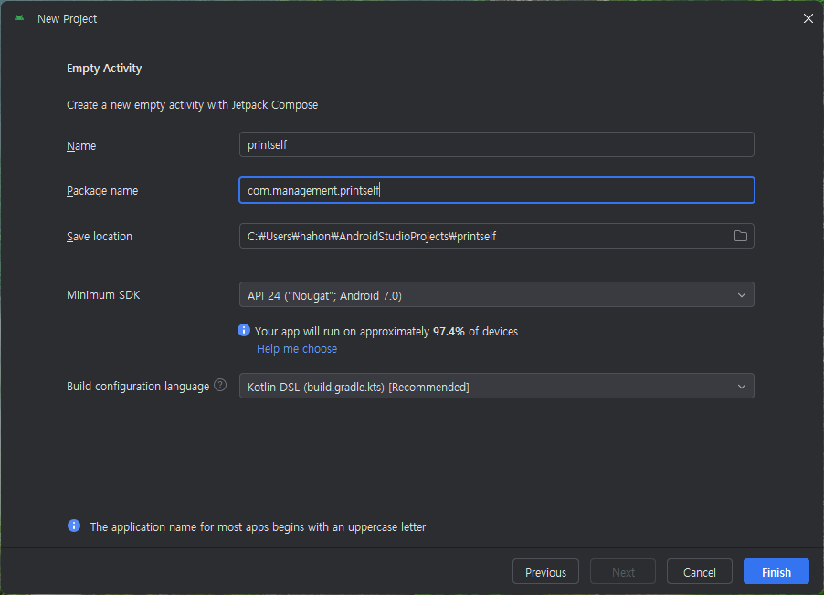 프로젝트 이름(Name), 패키지 이름(package name), 저장 경로(Save location), Minimum SDK, Build configuration language를 선택하고 [Finish] 버튼을 클릭한다.