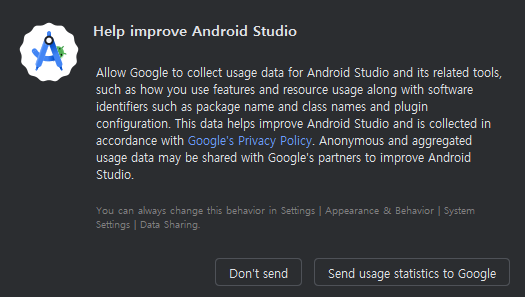 안드로이드 스튜디오 향상에 도움이 되는 정보를 보낼 건지 선택한다.