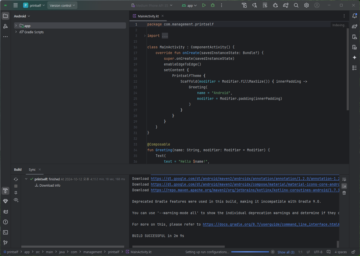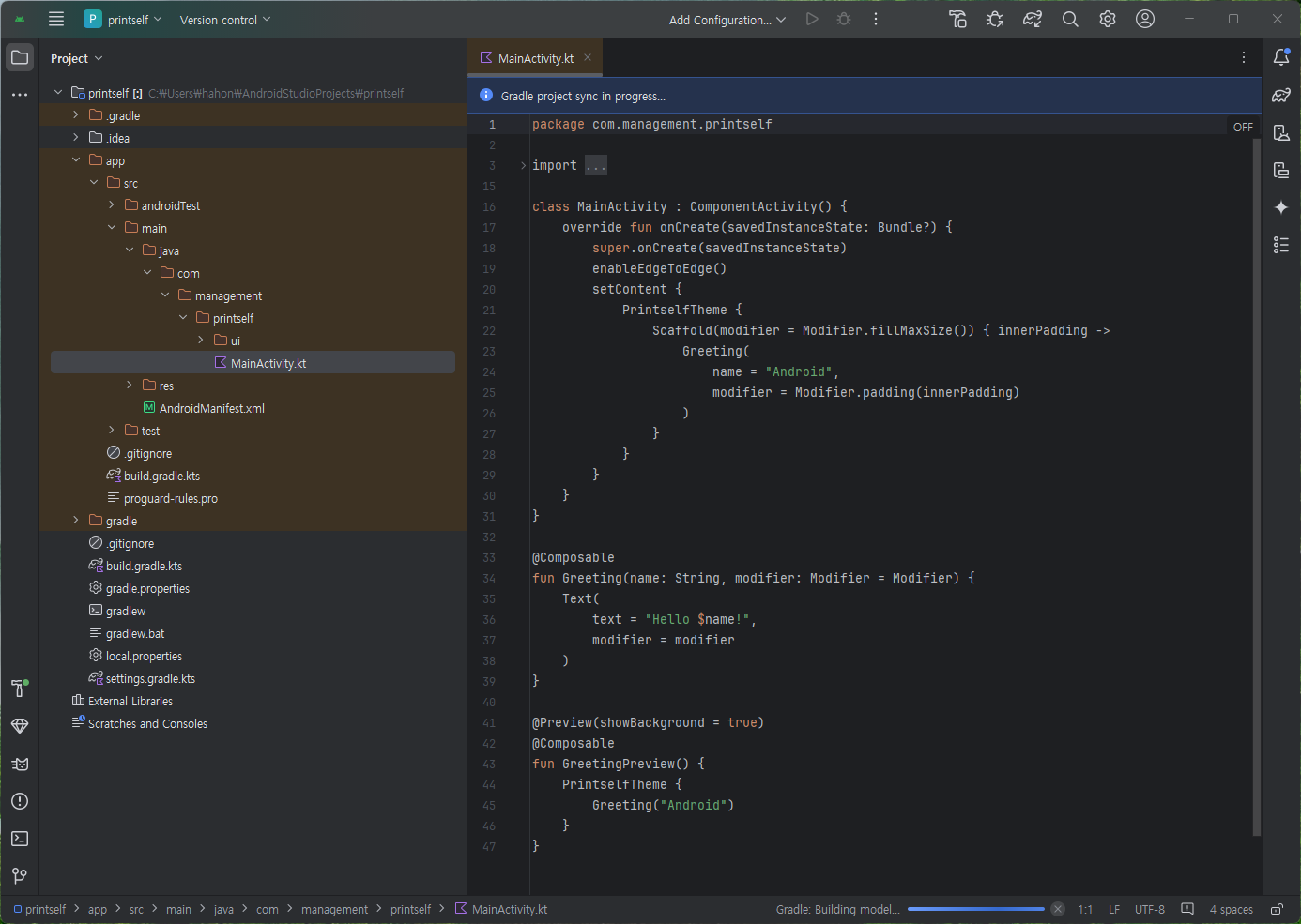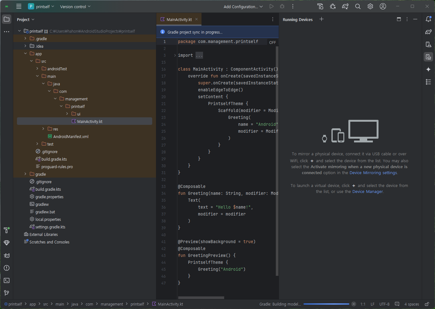 "Hello Android!" 출력 예제 프로젝트를 빌드(Build)를 진행해서 문법적인 오류가 없는지 확인한다.