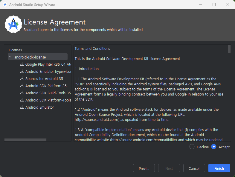라이선스 동의(License Agreement) 화면에서 내용을 확인하고 동의(Accept)를 선택하고 [Finish] 버튼을 클릭한다.
