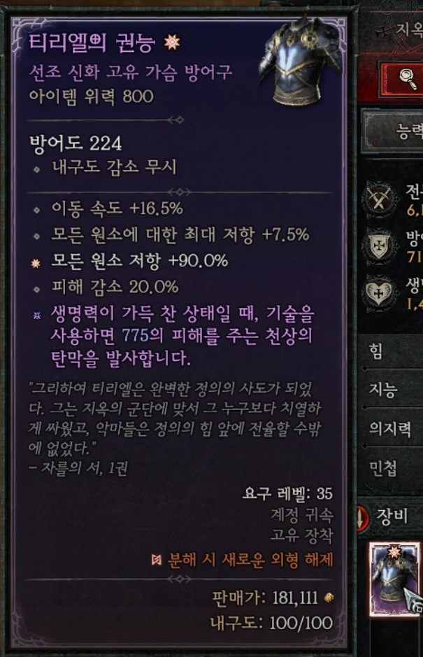 신화 고유 아이템은 랜덤방식으로 정해지며 현재 화면에서는 티리엘의 권능 가슴 방어구 아이템이다.