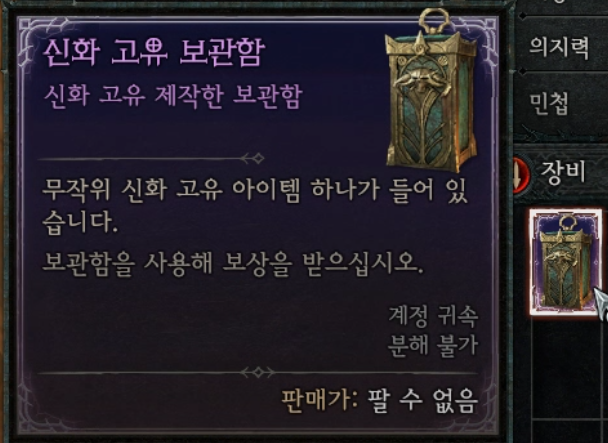 신화 고유 보관함 마우스 우측 클릭해서 상자 열기를 진행하면 아이템 1개가 바닥에 떨어진다.