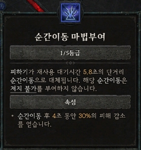 순간이동 스킬을 마법부여에 추가해서 스페이스바로 이동할 수 있으며 피하기 재사용 대기시간 감소 효과로 사용시간 단축을 할 수 있다.