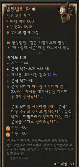 별똥별의 관 투구 아이템은 운석 낙하 재사용 대기시간이 일정 시간 이하일 경우 시간제한 없이 사용가능 하다.