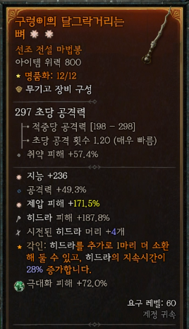 1-9. 한 손 무기: 구렁이의 달그락거리는 뼈 (각인: 히드라 1마리 더 소환, 지속시간 증가)