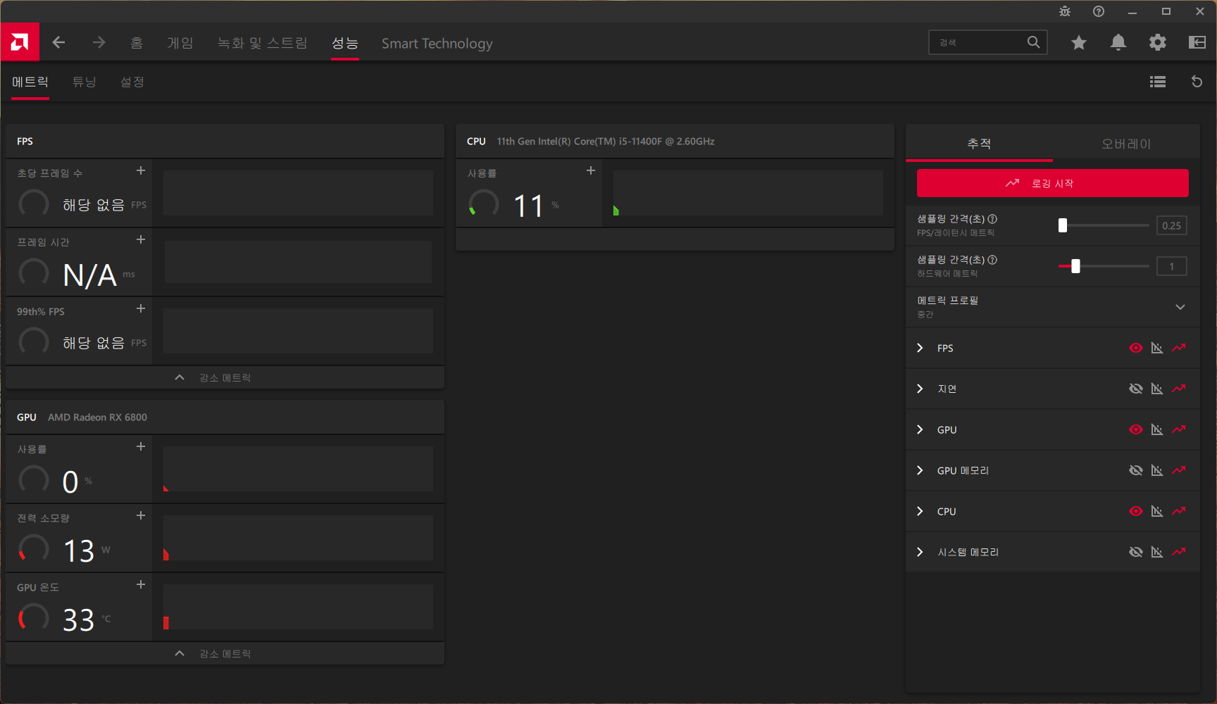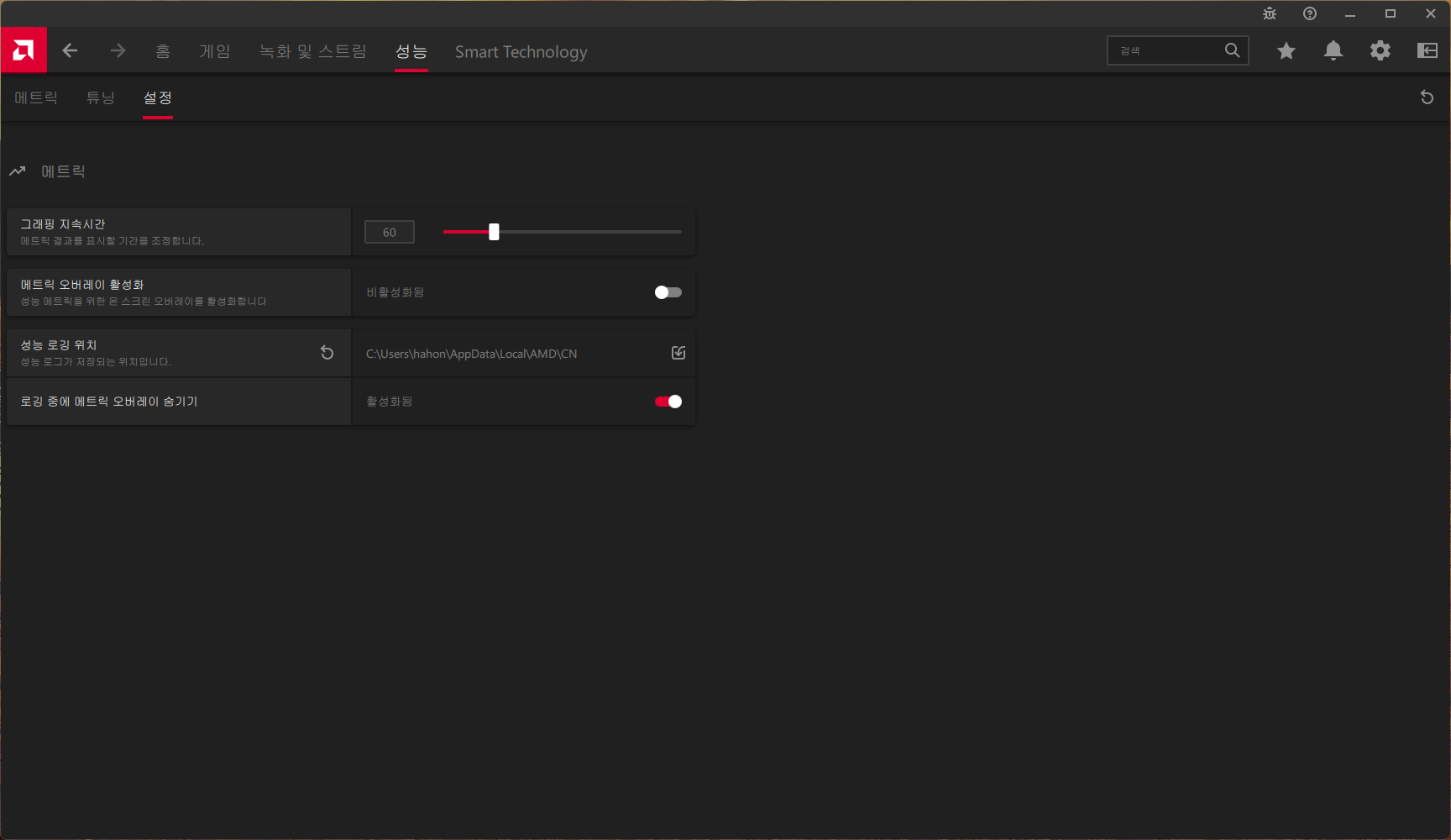 메트릭(그래핑 지속시간, 메트릭 오버레이 활성화, 성능 로깅 위치, 로깅 중에 오버레이 숨기기)