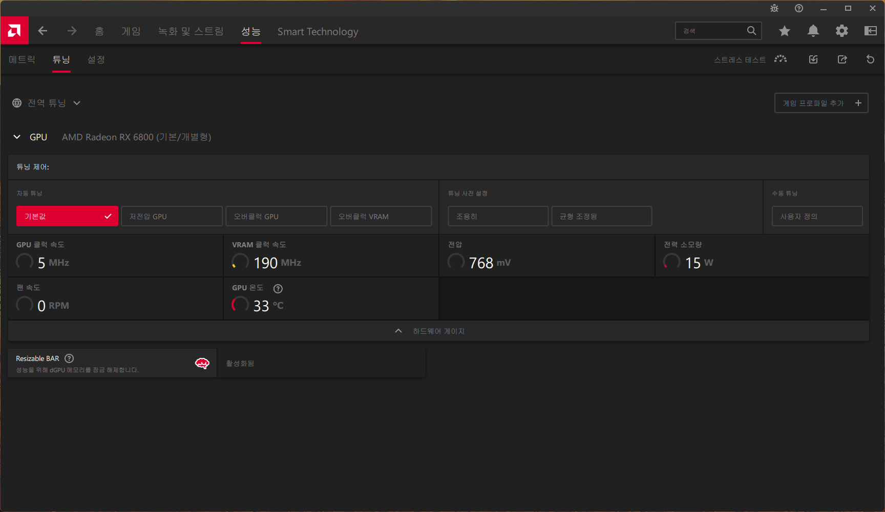 자동 튜닝(기본값, 저전악 GPU, 오버클럭 GPU, 오버클럭 VRAM)