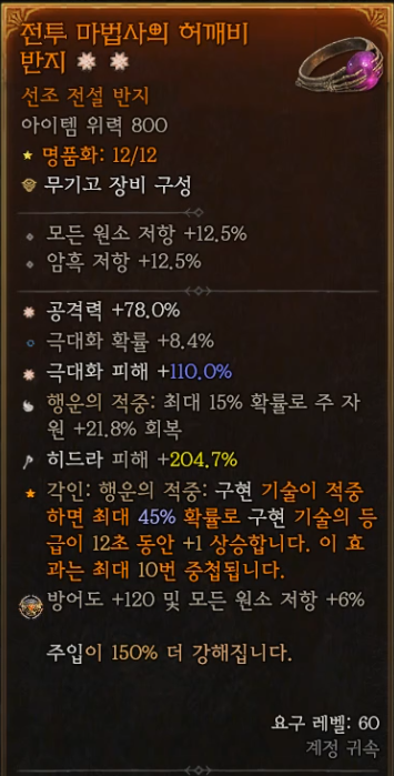 1-7. 반지1: 전투 마법사의 허깨비 반지 (각인: 구현 기술 적중 시 등급 상승) (보석: 주입이 150% 더 강해짐)
