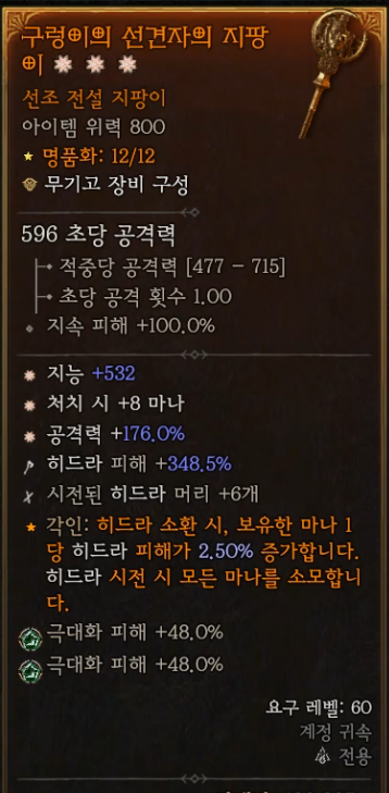 1-9: 양손 무기: 구렁이의 선견자의 지팡이 (각인: 히드라 소환 시 마나 1당 히드라 피해 증가)