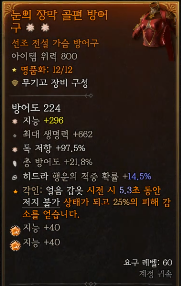 1-2. 가슴 방어구: 눈의 장막 골편 방어구 (각인: 얼음 갑옷 시전 시 저지 불가, 피해 감소)