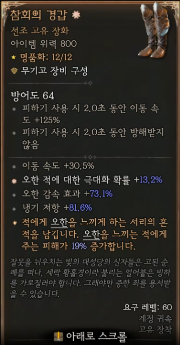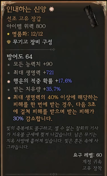 장갑: 인내하는 신앙(최대 생명력의 40% 이상의 피해를 한 번에 받는 경우, 다음 3초에 걸쳐 피해 받음)