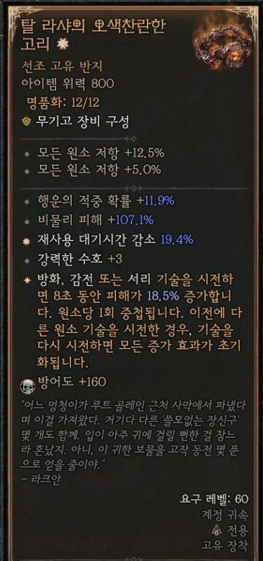 1-8. 반지 2: 탈 라샤의 오색찬란한 고리(방화,감전,서리 기술 시전 피해 증가)