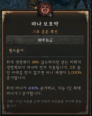 6-4. 고유 혼돈 특전: 마나 보호막(최대 생명력 감소하지만 받는 피해 마나 먼저 적용, 마나 재생 증가)
