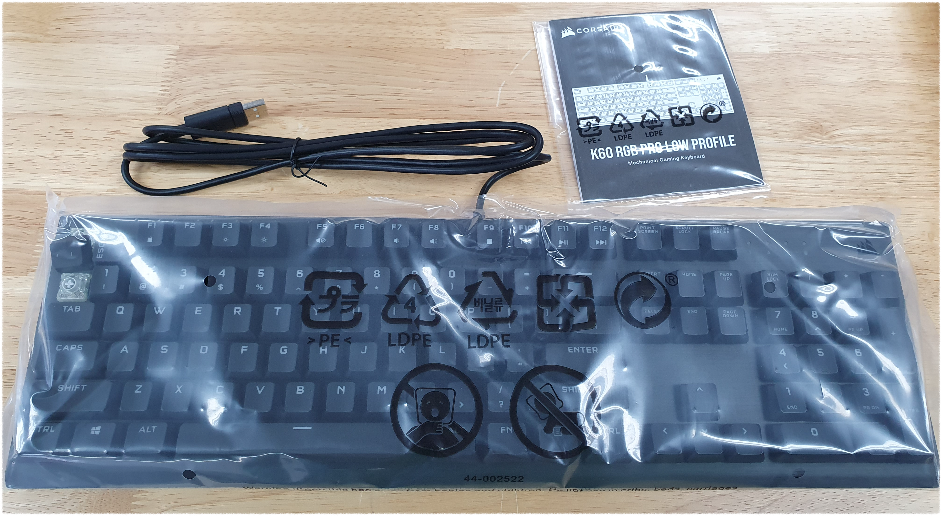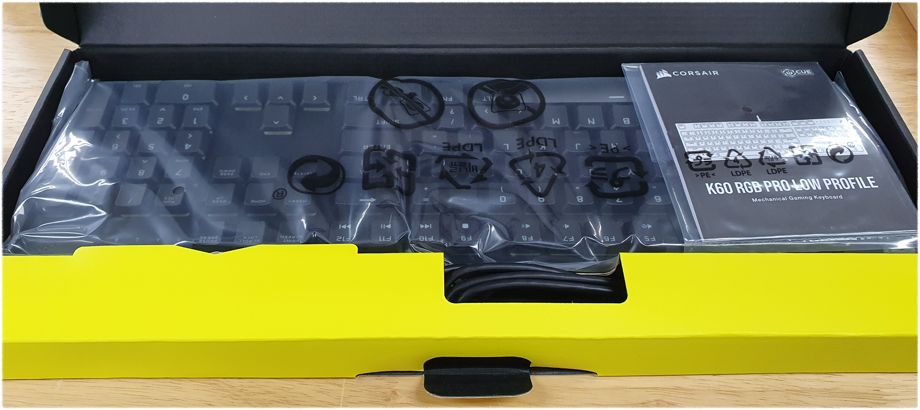 제품 박스 개봉 시 키보드는 비닐에 싸져 있으며 유선으로 연결 가능한 방식으로 되어 있다.