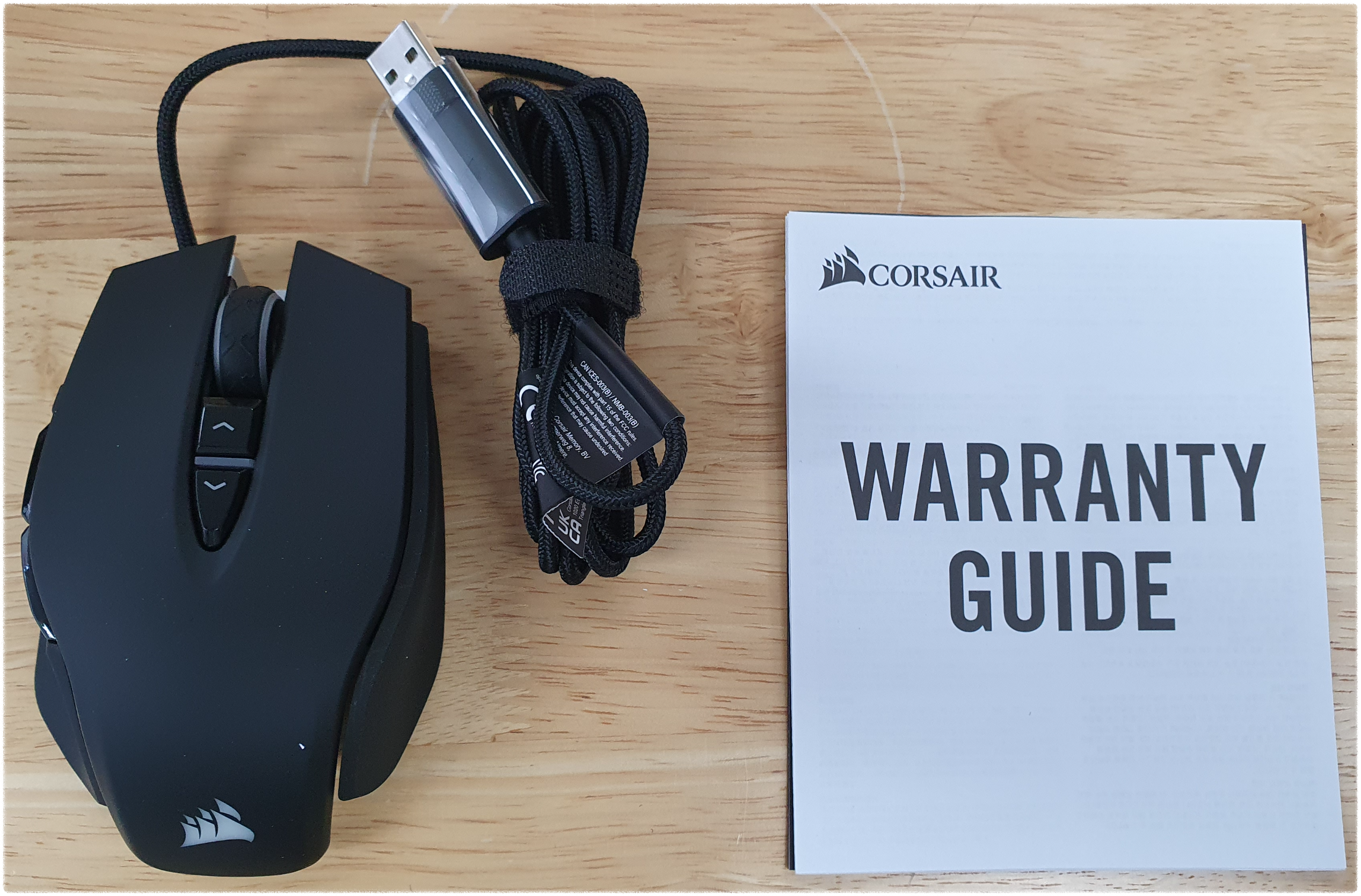 제품 박스 개봉 시 워런티 가이드(WARRANTY GUIDE), 마우스가 들어 있으며 CUE 소프트웨어로 커스터마이징 가능하다.