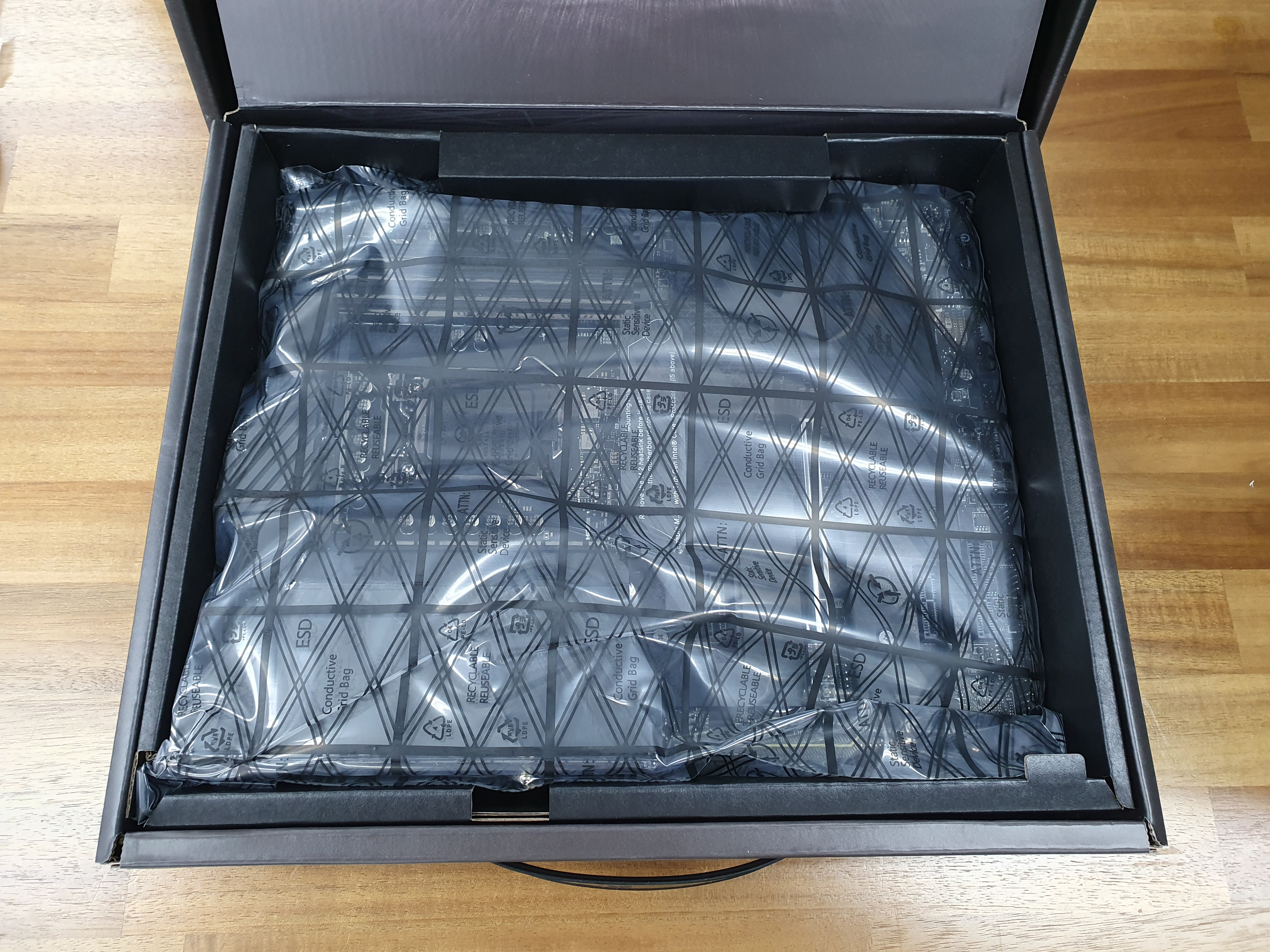 제품 박스 개봉 시 비닐에 담겨 있는 메인보드가 보이며 뒷 부분에는 부가 품목이 들어 있다.