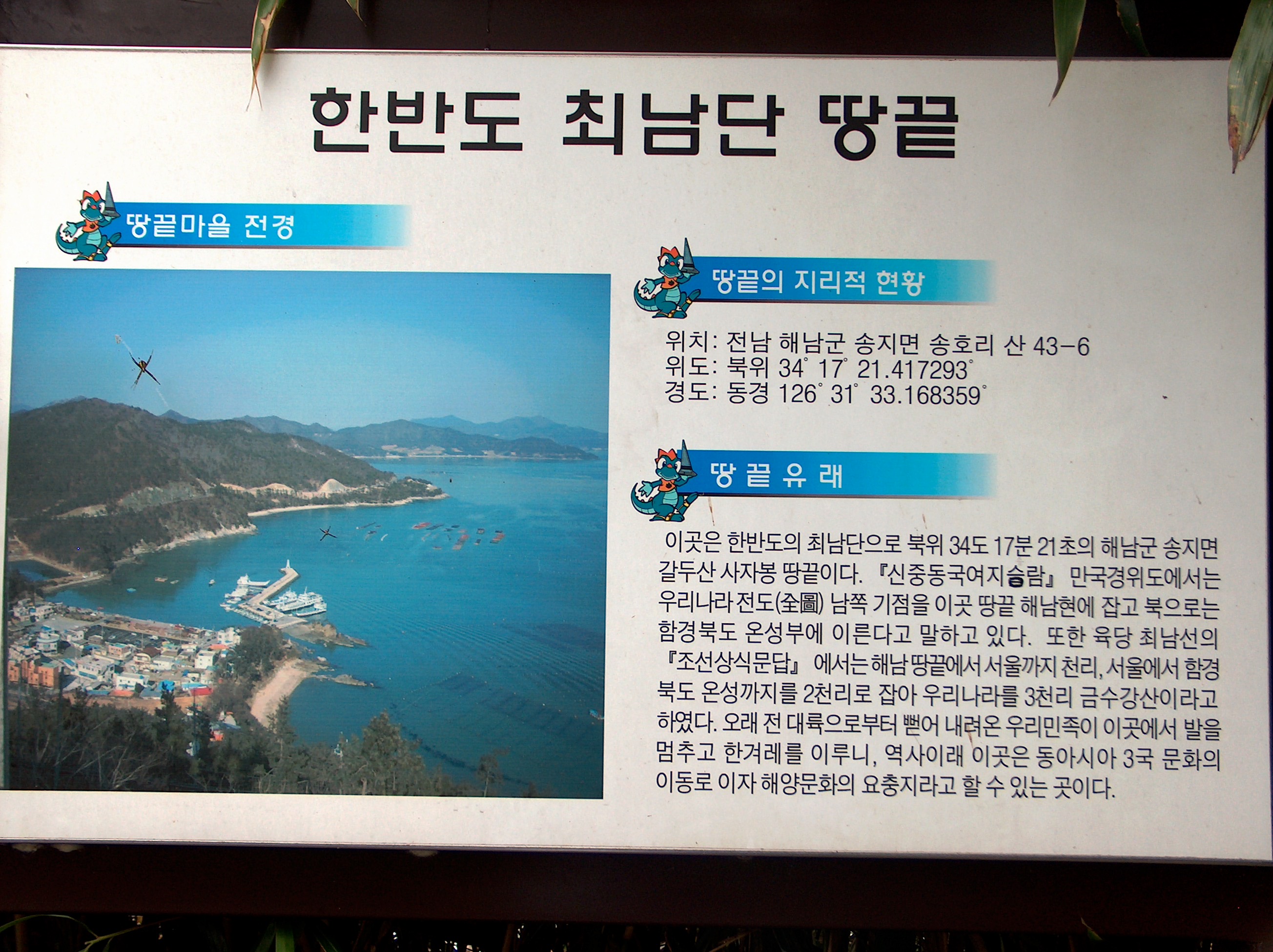 '신중동국여지승람' 만국경위도에서는 우리나라 전도 남쪽 기점을 이곳 땅끝 해남현에 잡고 북으로는 함경북도 온성부에 이른다고 말하고 있다.