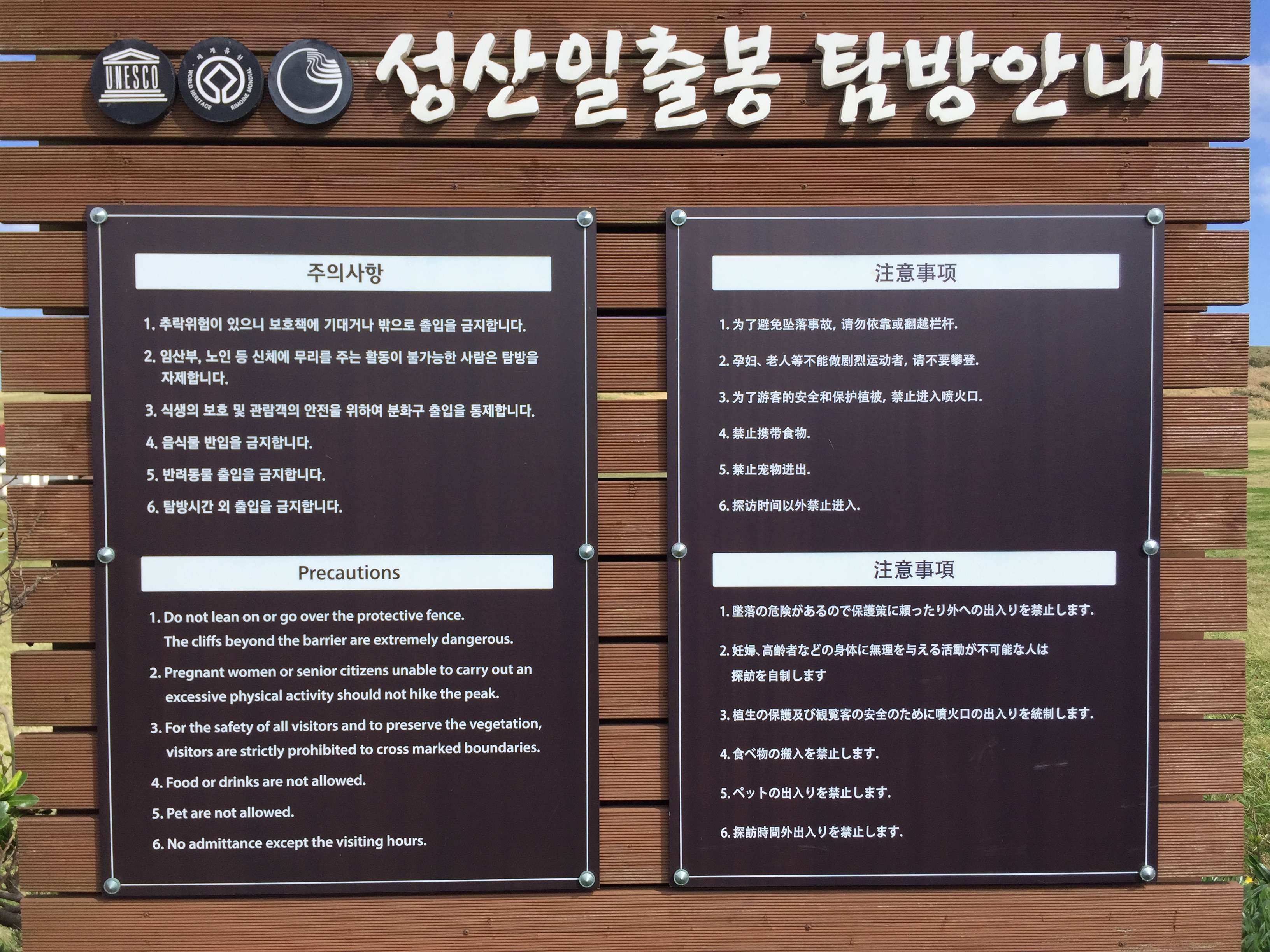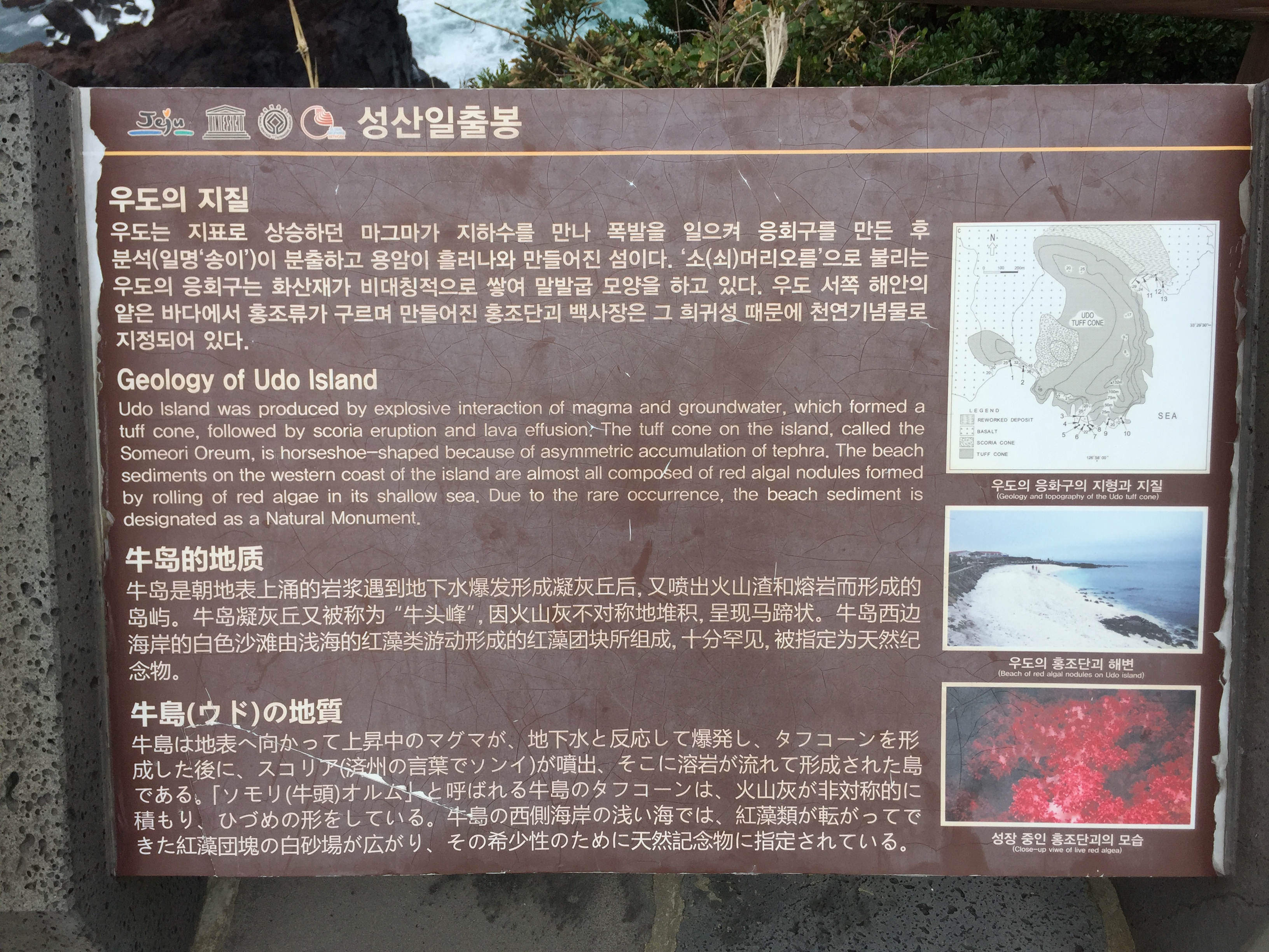 해발 180m인 성산 일출봉은 약 5,000년 전 제주도 수많은 분화구 중에서는 드물게 바닷속에서 수중폭발한 화산체이다. 용암이 물에 섞일 때 일어나는 폭발로 용안은 고운 화산재로 부서져 분화구 둘레에 원뿔형으로 쌓여 있다.