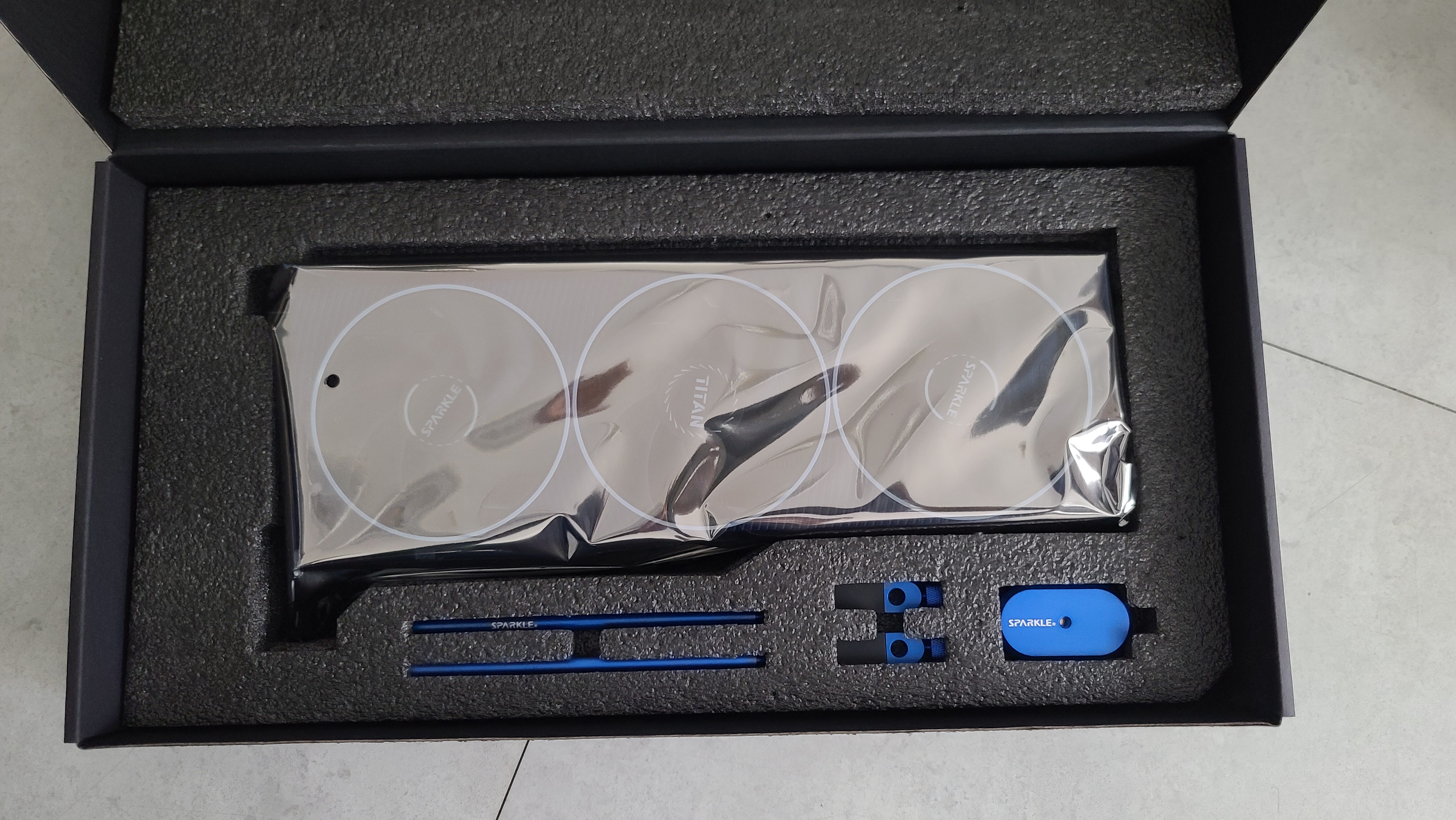 제품 박스 개봉 시 그래픽카드는 비닐에 싸져 있으며 그래픽 카드 지지대가 포함되어 있다.