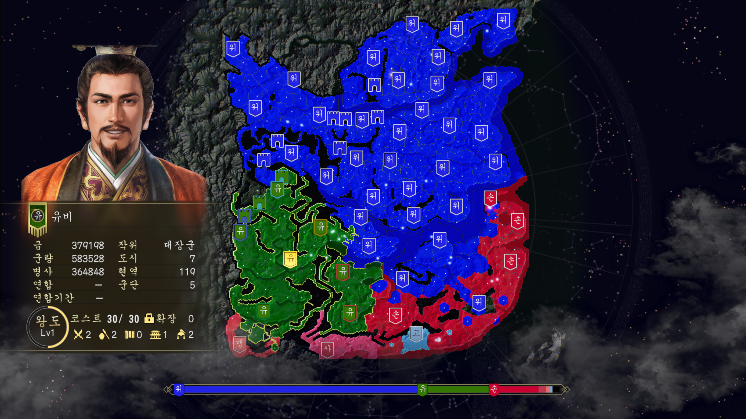 게임 시작 시 전체 지도에서 각 나라별 군주를 정할 수 있으며 각 세력별 금, 군량, 병사, 작위, 도시, 현역, 군단 정보를 확인할 수 있다.