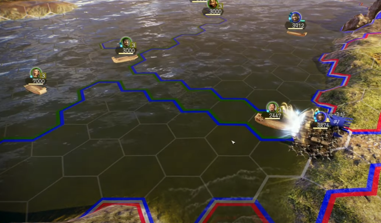 강으로 표시된 부분으로 이동 시에 배 모양으로 표시가 되며 항구 지점을 함락해야 지나갈 수 있는 지점도 있다.