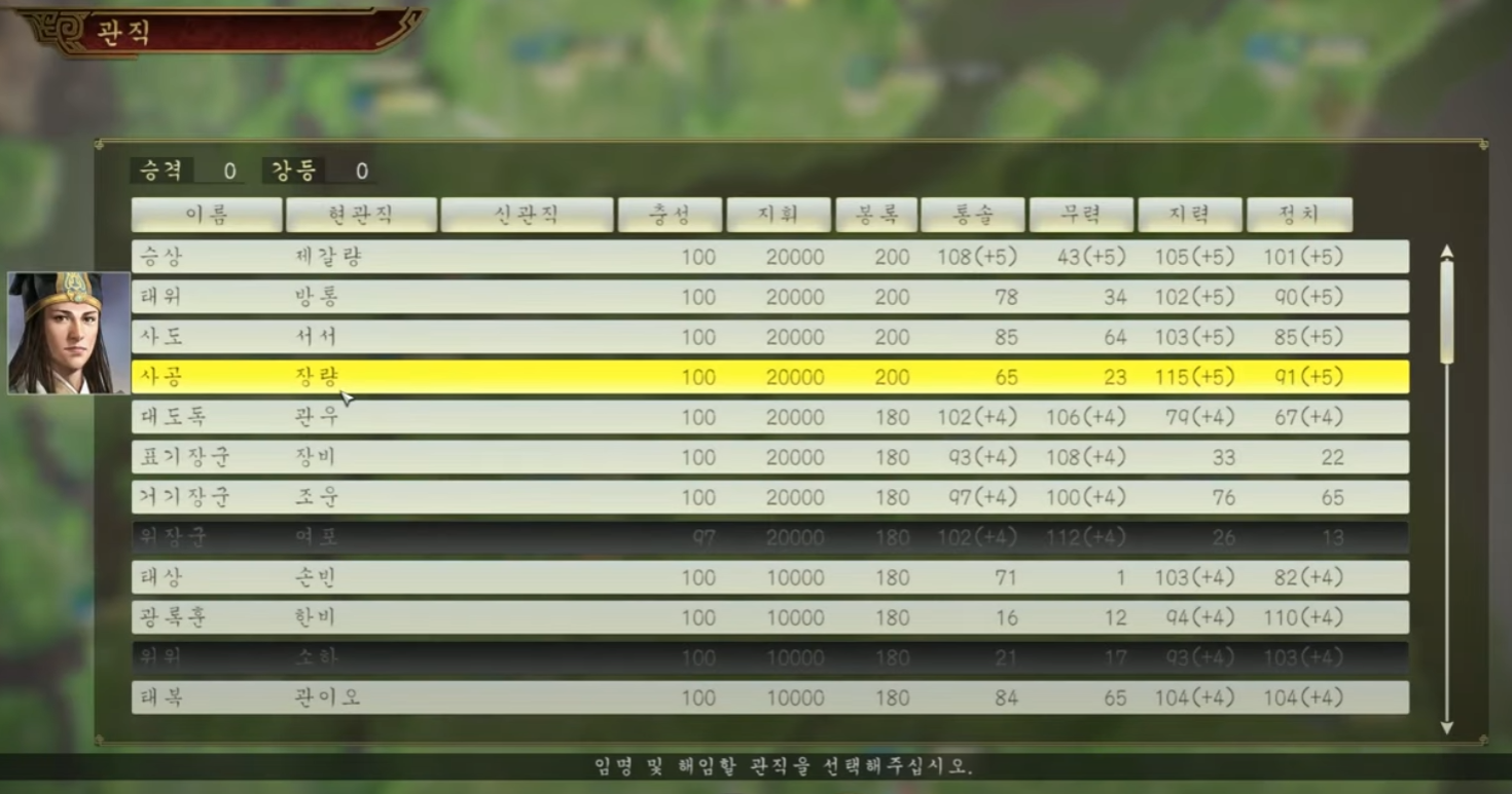 군주와 군사는 기본적으로 1명이 배치되고 전투, 지원, 모략, 내정, 인사에 각 정책에 맞는 인재를 지정할 수 있다.