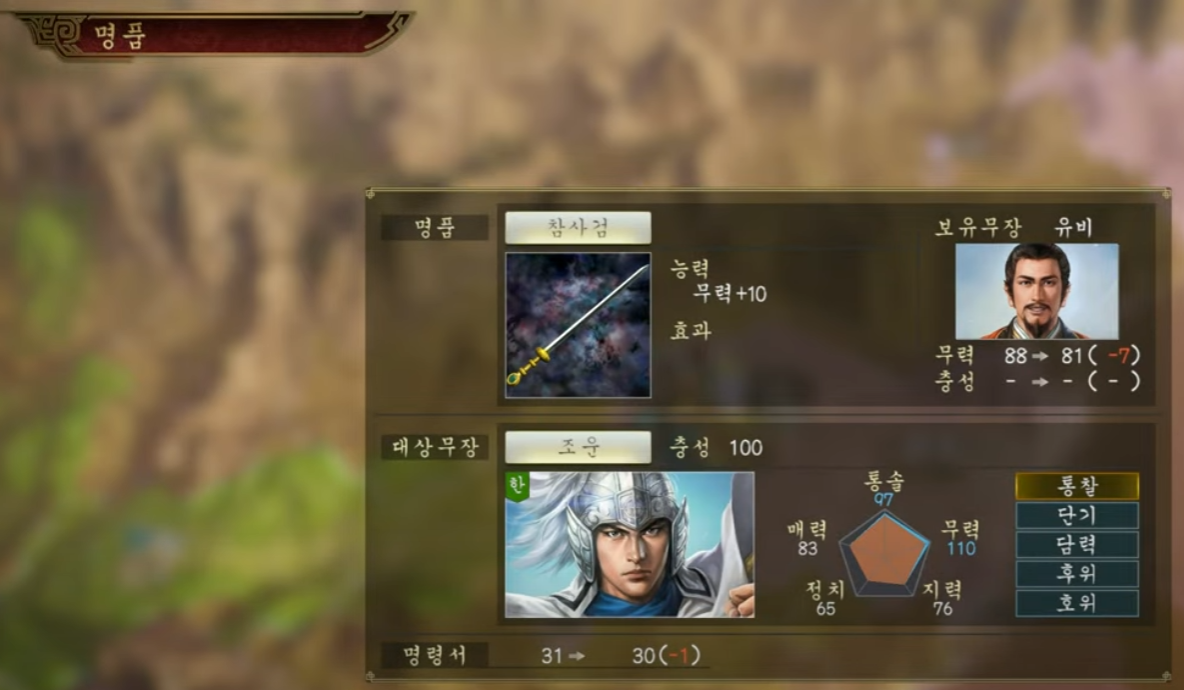 명품을 무장에게 주게 되면 명품에 맞는 능력과 효과를 지니게 된다.