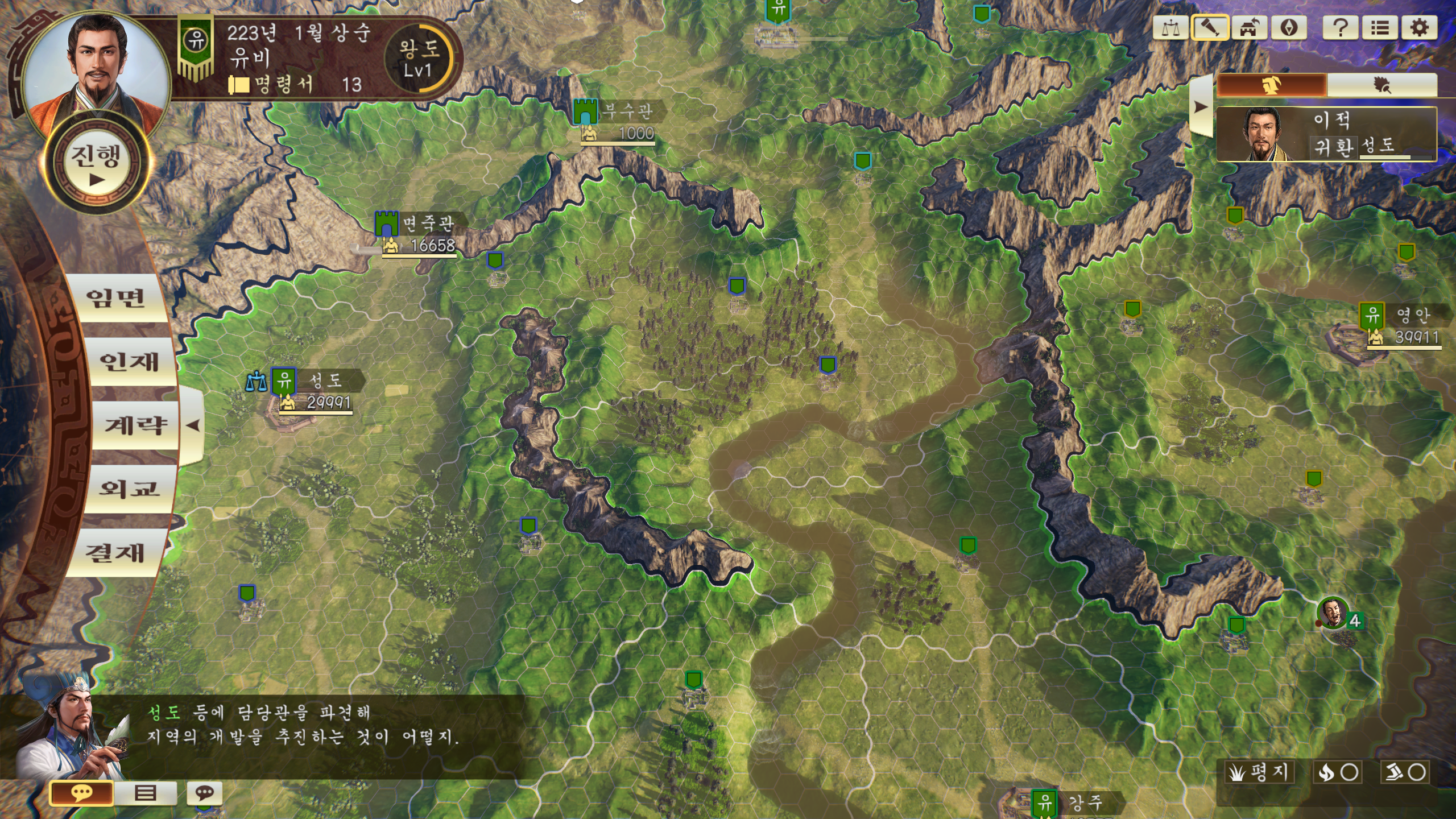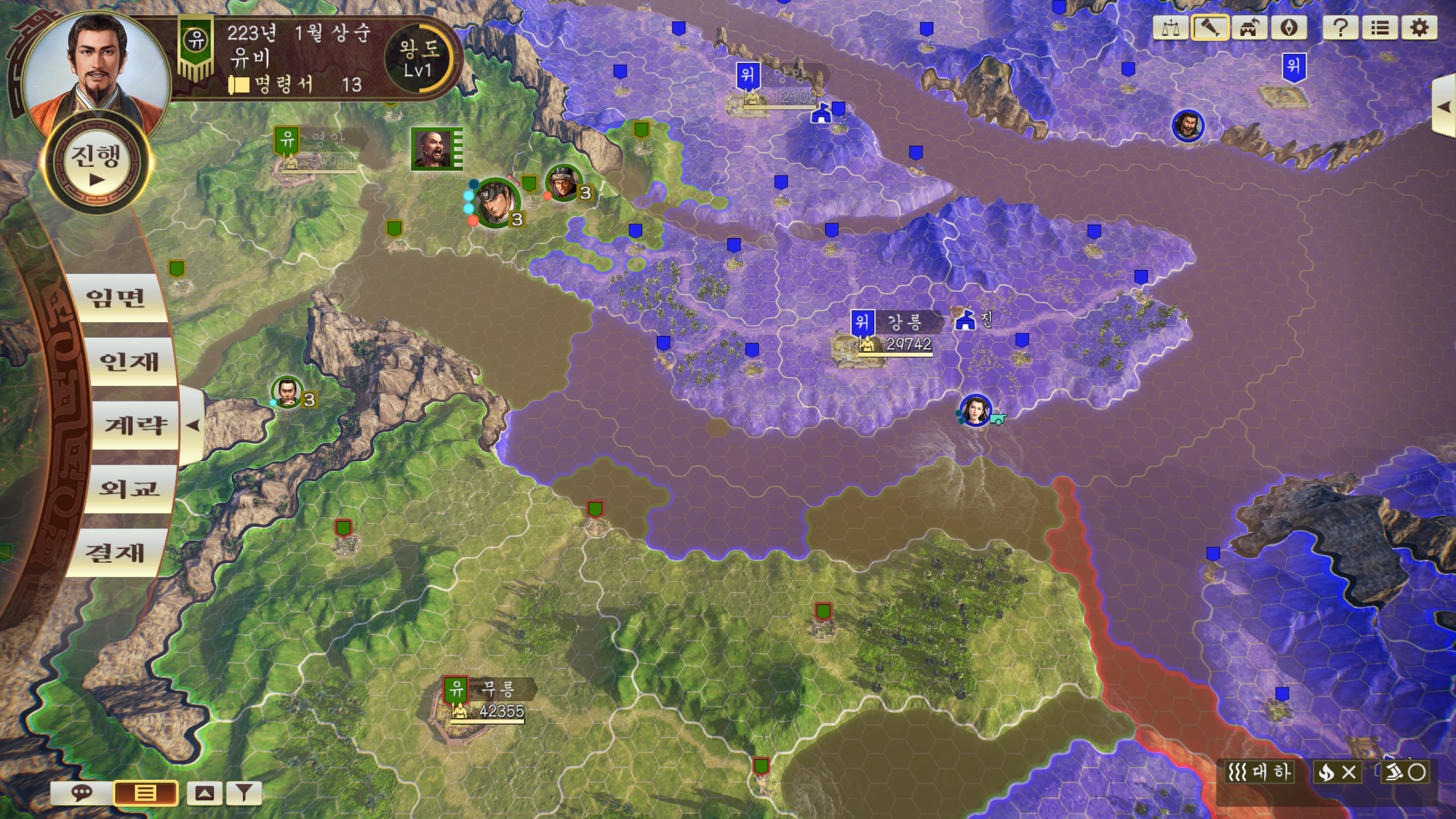 임면, 인재, 계략, 외교, 결재 메뉴를 이용해서 전략적인 플레이를 할 수 있다.