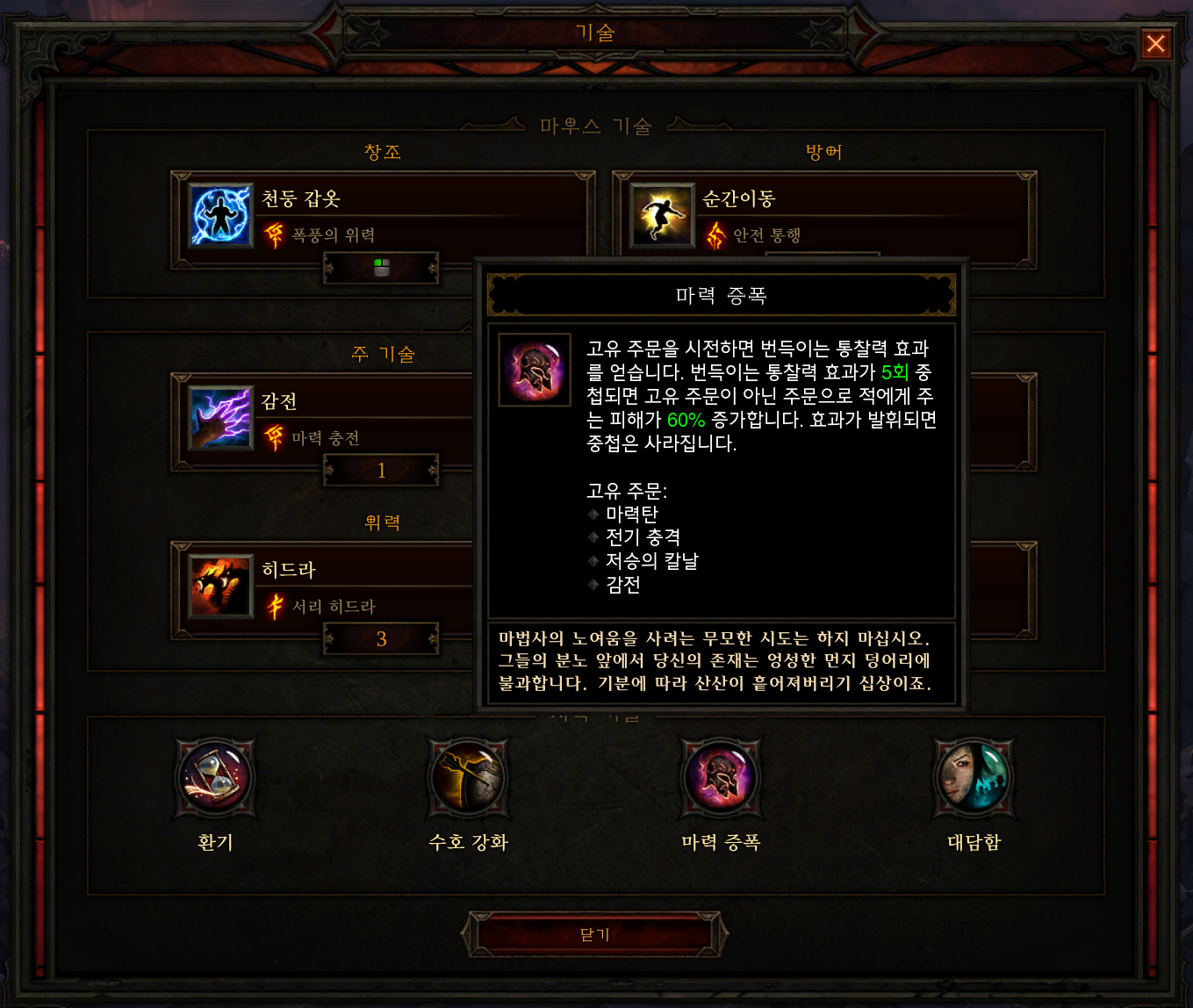 번득이는 통찰력 효과과 5회 중첩되면 고유 주문이 아닌 주문으로 적에게 주는 피해가 60% 증가합니다.