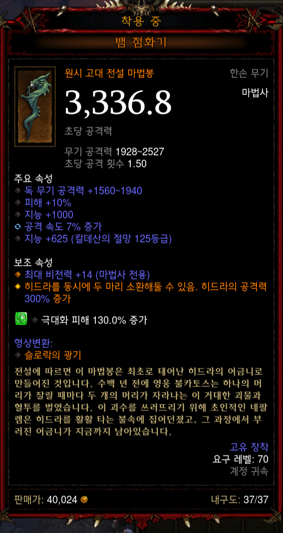한 손 무기로는 뱀 점화기로 히드라 두 마리 소환, 히드라 공격력 증가를 추천한다.