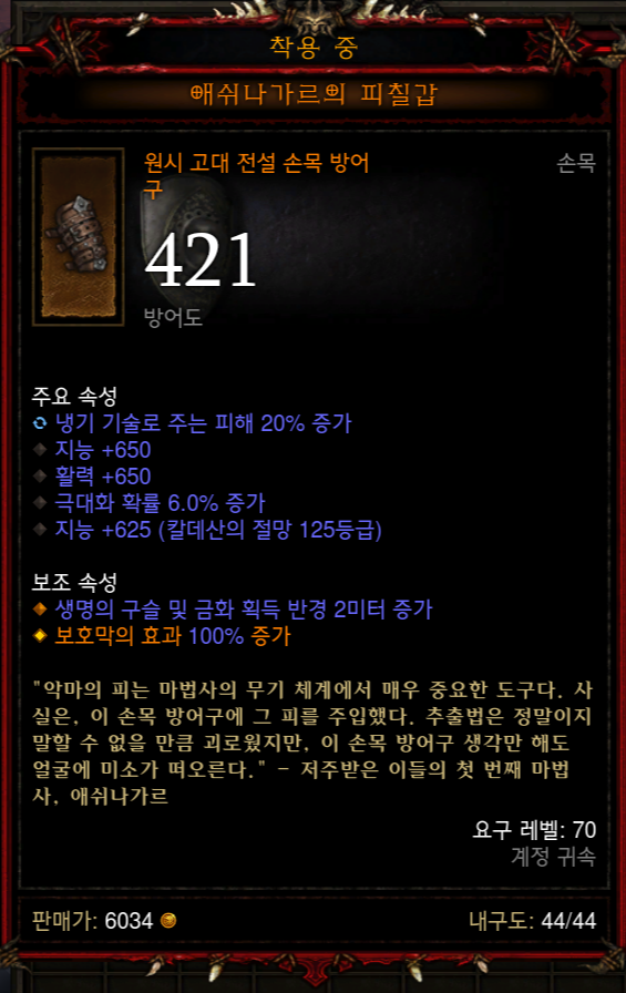 애쉬나가르의 피칠갑 손목 방어구는 방어 아이템으로 보조 속성에 있는 보호막 효과를 추천한다.
