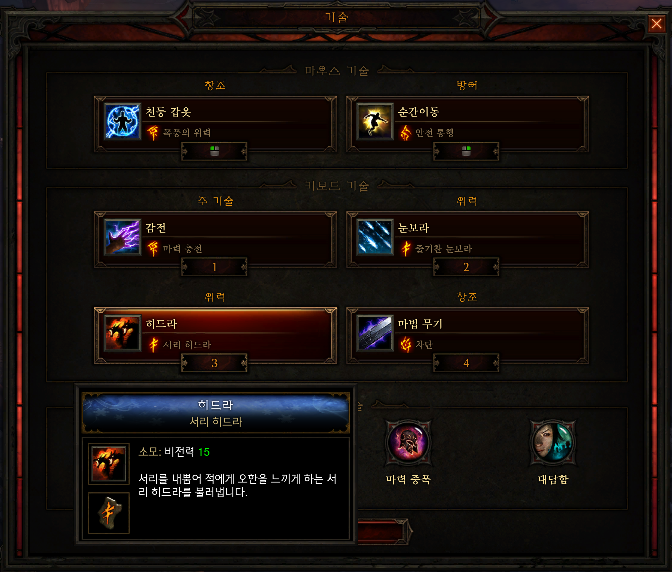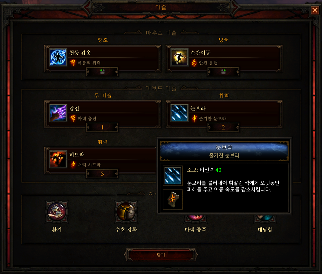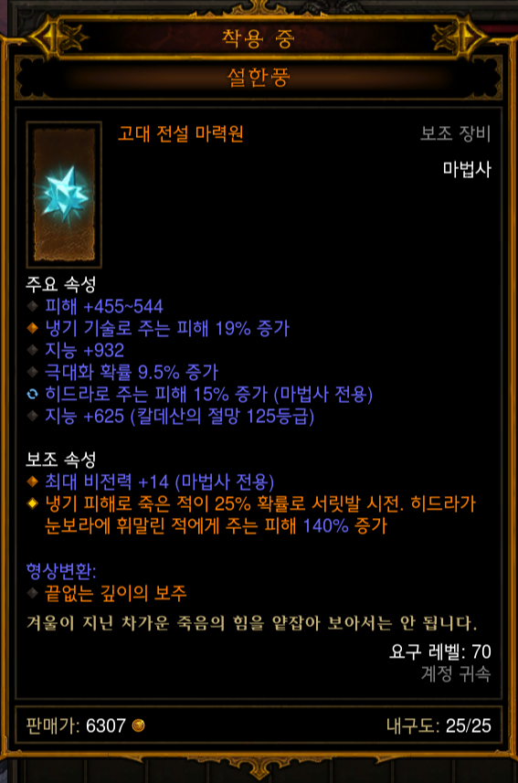마력원은 설한풍으로 히드라 피해 증가와 서릿발 시전 효과를 추천한다.