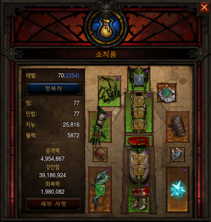 투구는 최상급 다이아로 재사용 대기 시간 감소, 가슴 방어구와 바지에는 최상급 토파즈로 지능을 높인다.