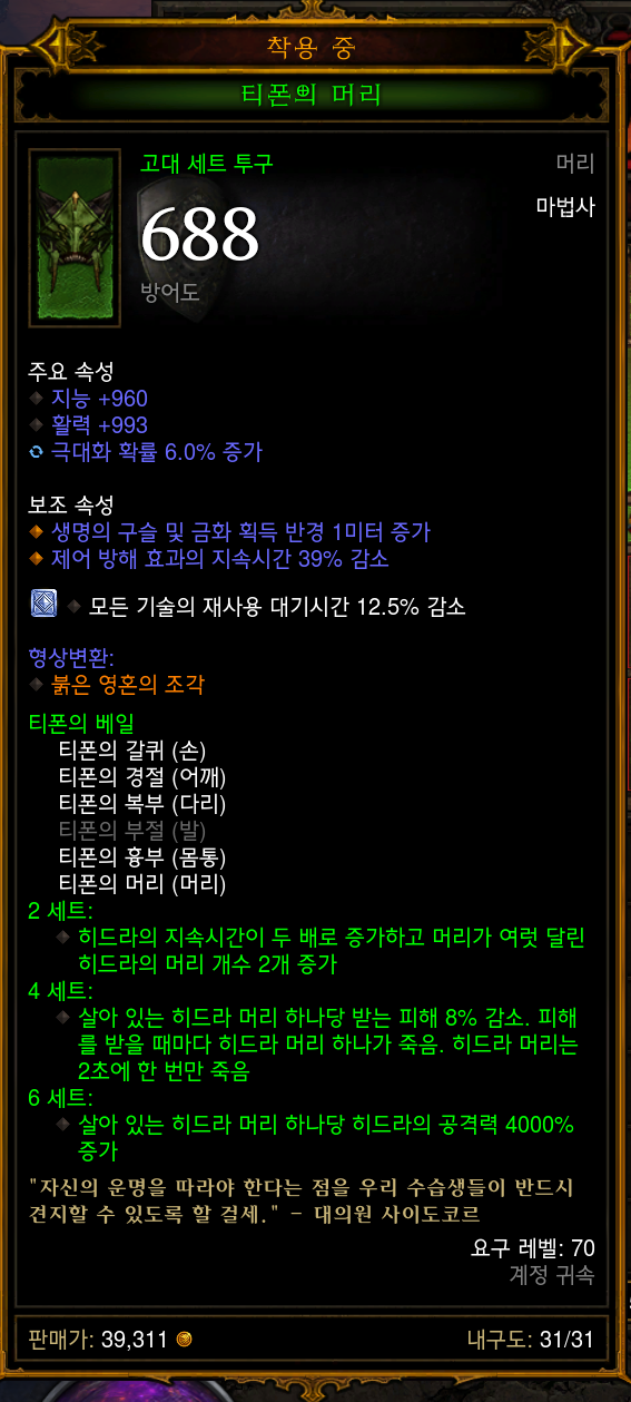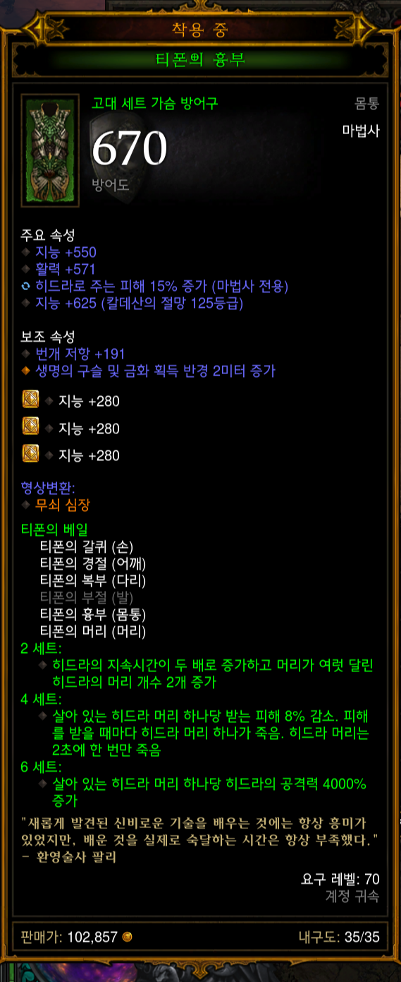 티폰 세트 아이템은 히드라에 맞춰진 세트 아이템으로 6세트 효과가 발휘될 수 있게 착용한다.