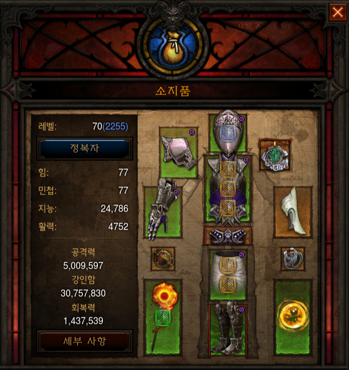 투구에는 최상급 다이아로 재사용 대기시간 감소, 가슴 방어구와 바지는 최상급 토파즈로 지능을 높인다.