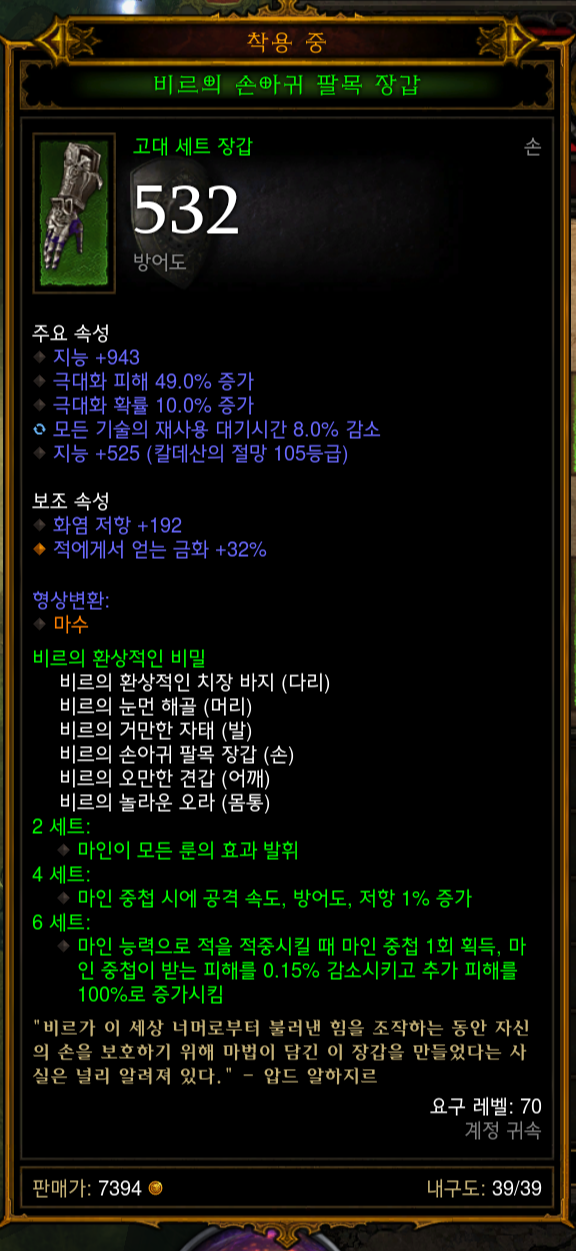 비르의 환성적인 비밀 세트 아이템은 마인으로 변신하는 마법사에게 필요하며 6세트 효과로 착용한다.