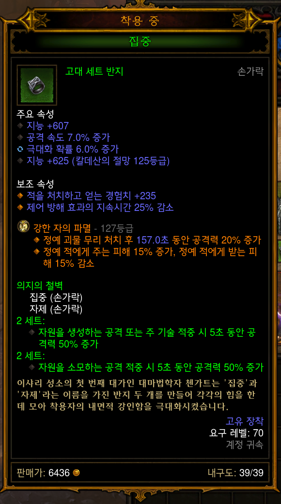 비전 보주 공격력과 감속 지대 효과가 있는 불안정한 홀, 절대자의 왕관과 세트 아이템 착용 1개 감소 효과를 지닌 왕실 권위의 반지를 추천한다.