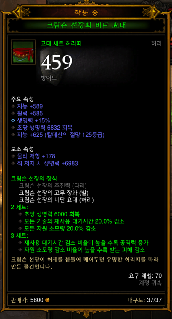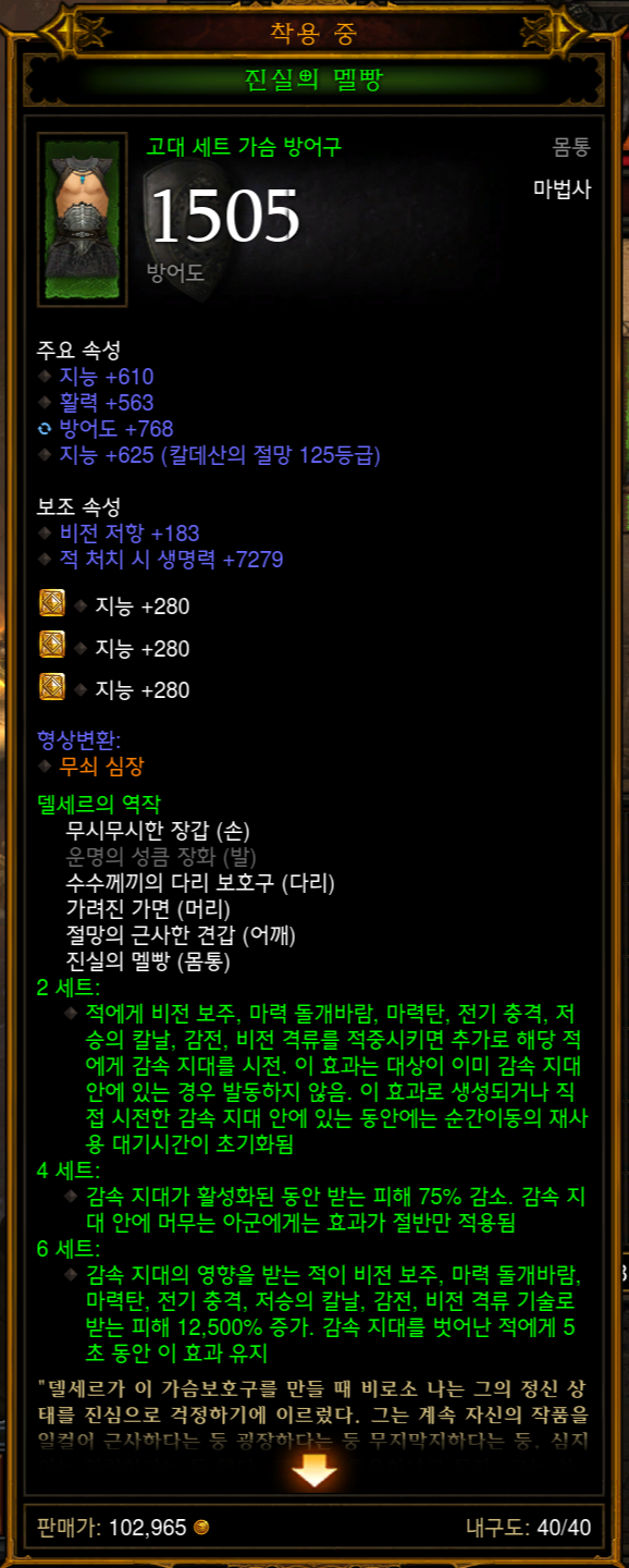 투구에는 최상급 다이아로 재사용 대기시간 감소, 가슴 방어구와 바지는 최상급 토파즈로 지능을 높인다.