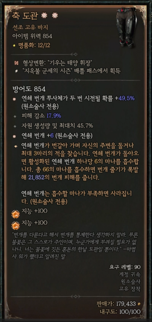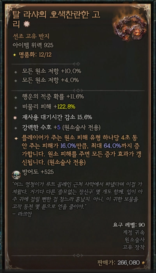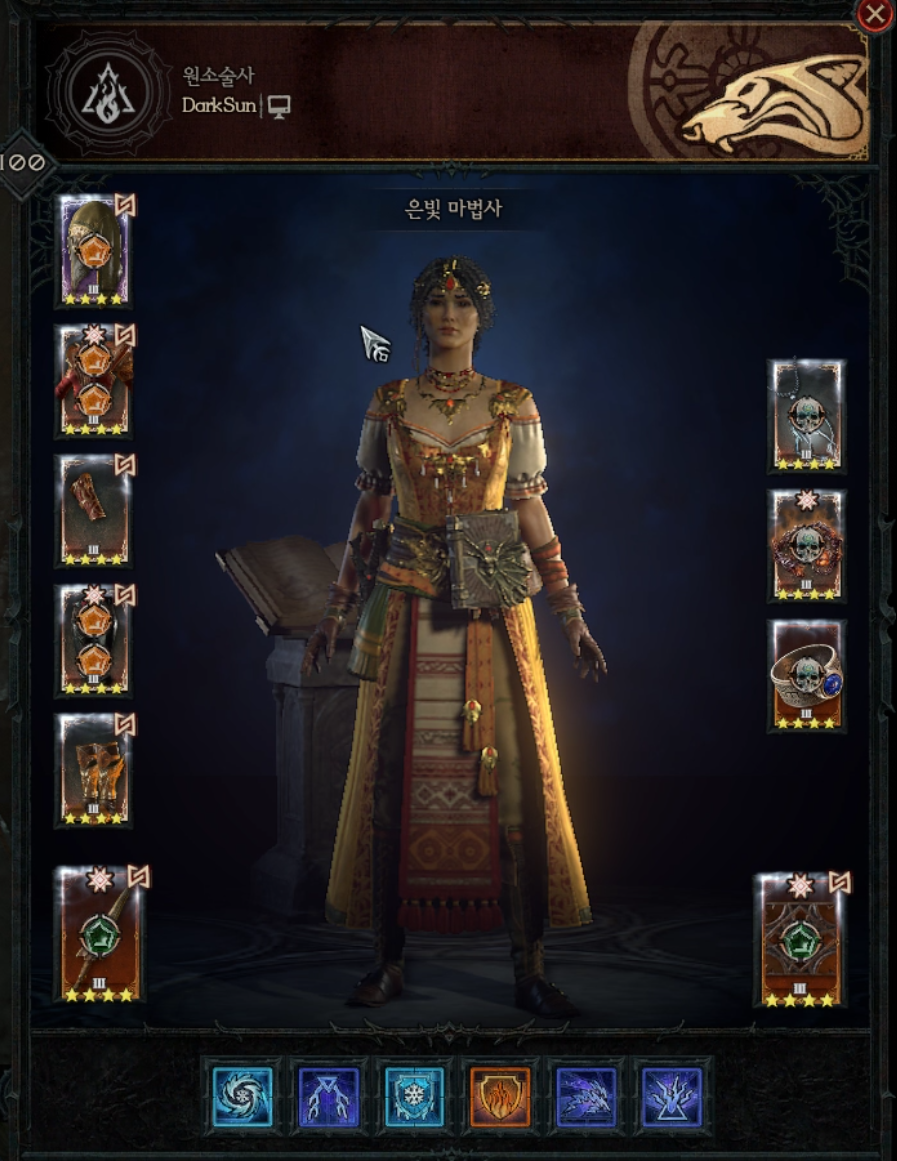 번개 스킬 관련 대미지를 최대한 높이는 방향으로 아이템을 갖추고 몬스터를 상대하는 원소술사이다.