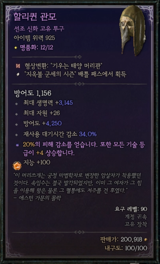 1. 할리퀸 관모(20% 피해감소, 재사용 대기시간 감소, 모든 기술 등급 +4)