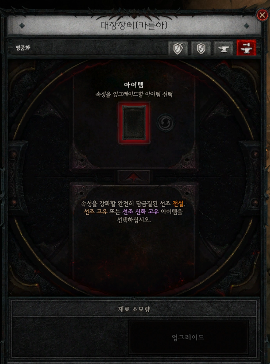 속성을 강화할 완전히 담금질된 선조 전설, 선조 고유 또는 선조 신화 고유 아이템을 선택하십시오.