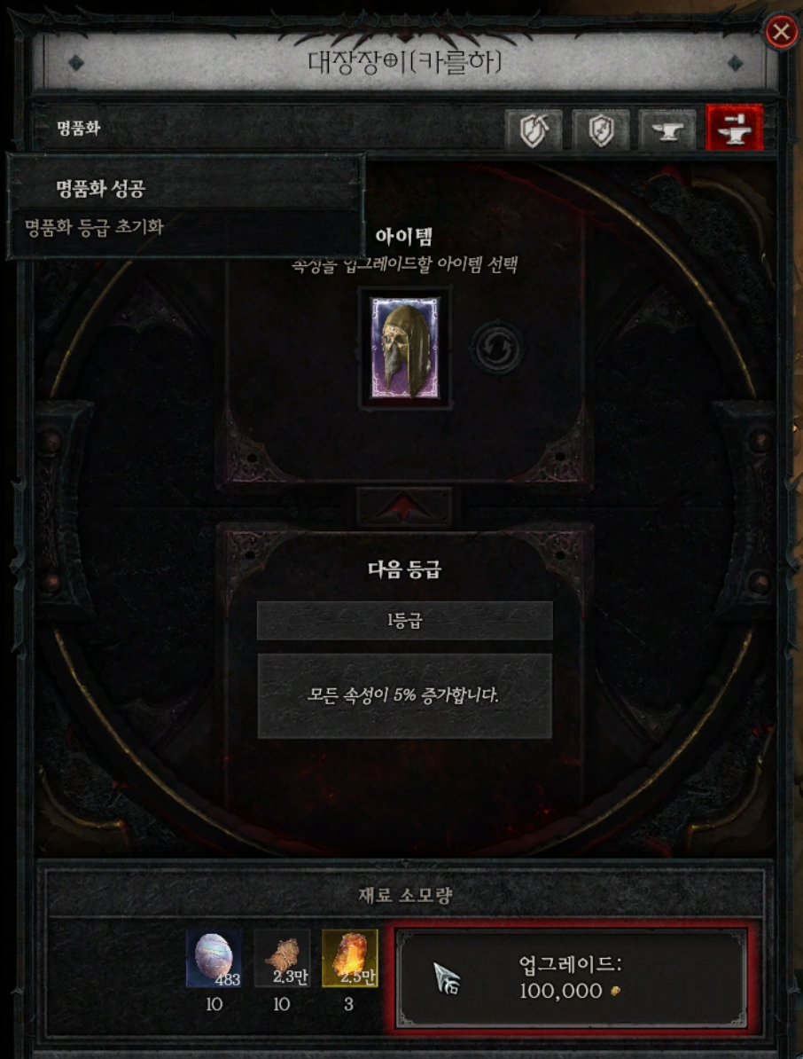 명품화 등급을 초기화할 때 재료 및 금화 필요.