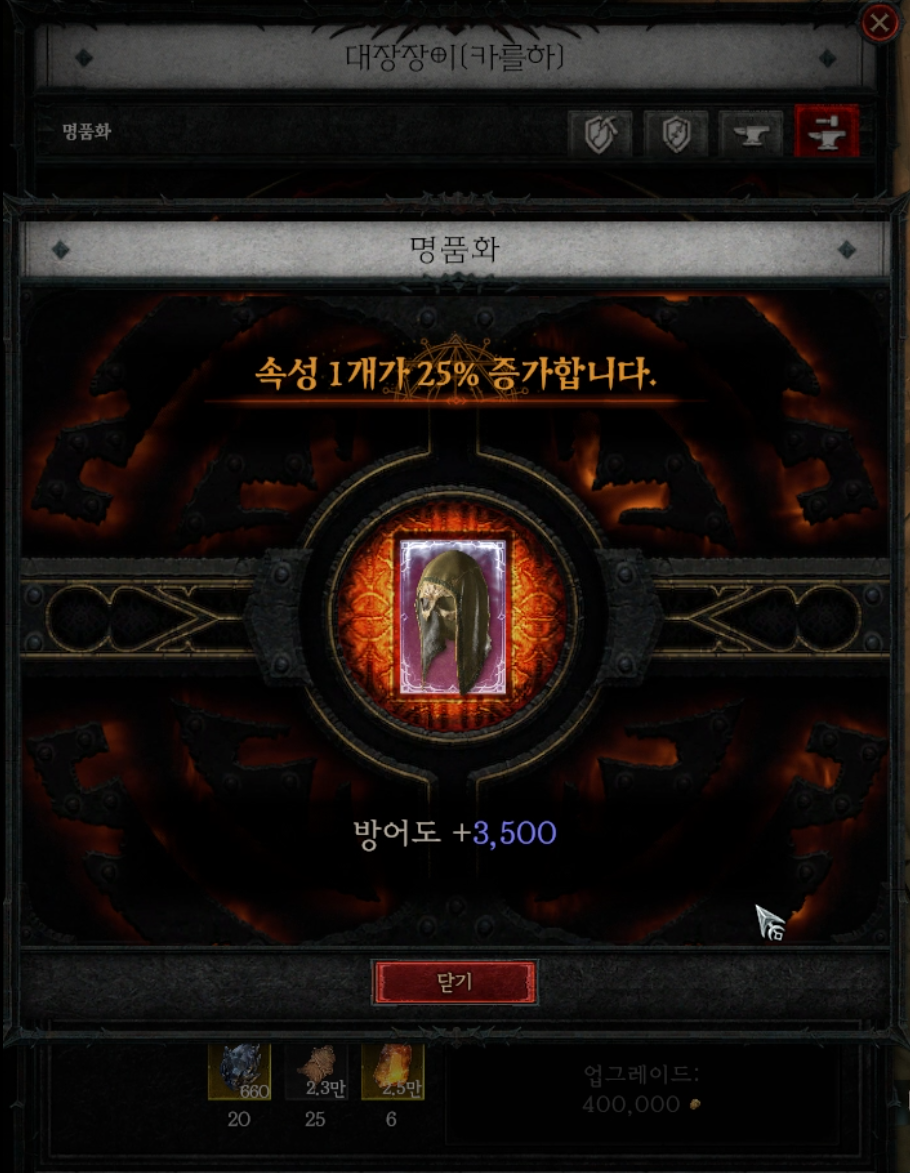 명품화를 원하는 1개 속성을 4등급+4등급+4등급=12등급으로 3단계 업그레이드 가능함.