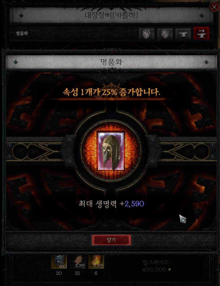 명품화는 선조 전설, 선조 고유, 선조 신화 고유 아이템만 가능하다.