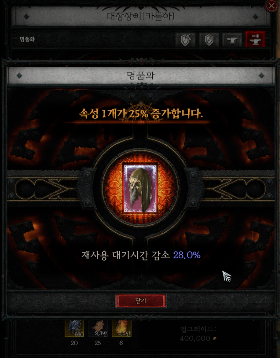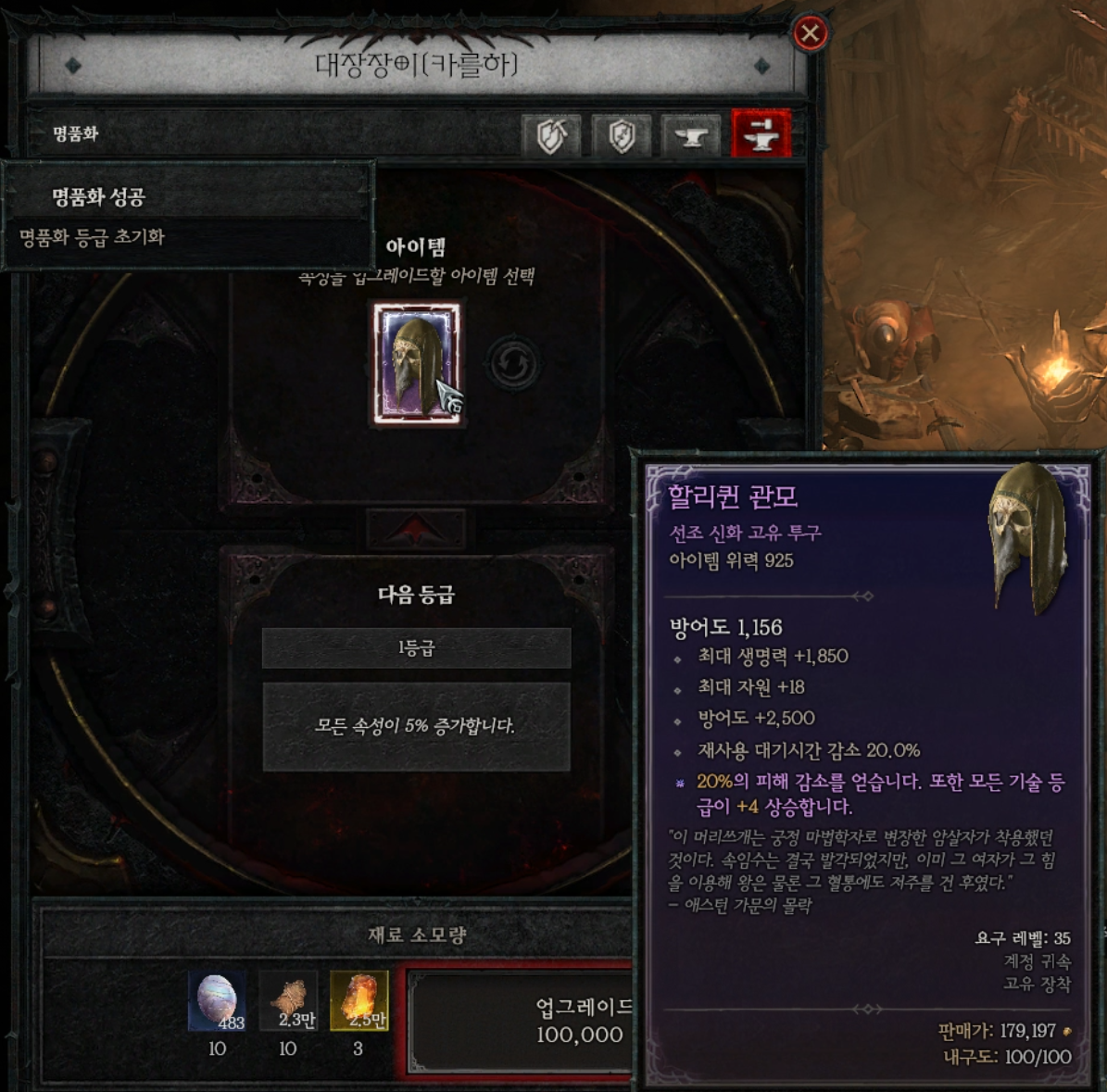 명품화 등급을 초기화할 때 재료 및 금화 필요.