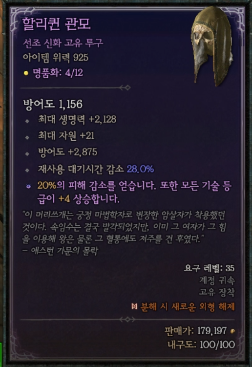 할리퀸 관모 선조 신화 고유 투구를 올려놓으면 1등급을 올릴 때 모든 속성이 5% 증가한다.