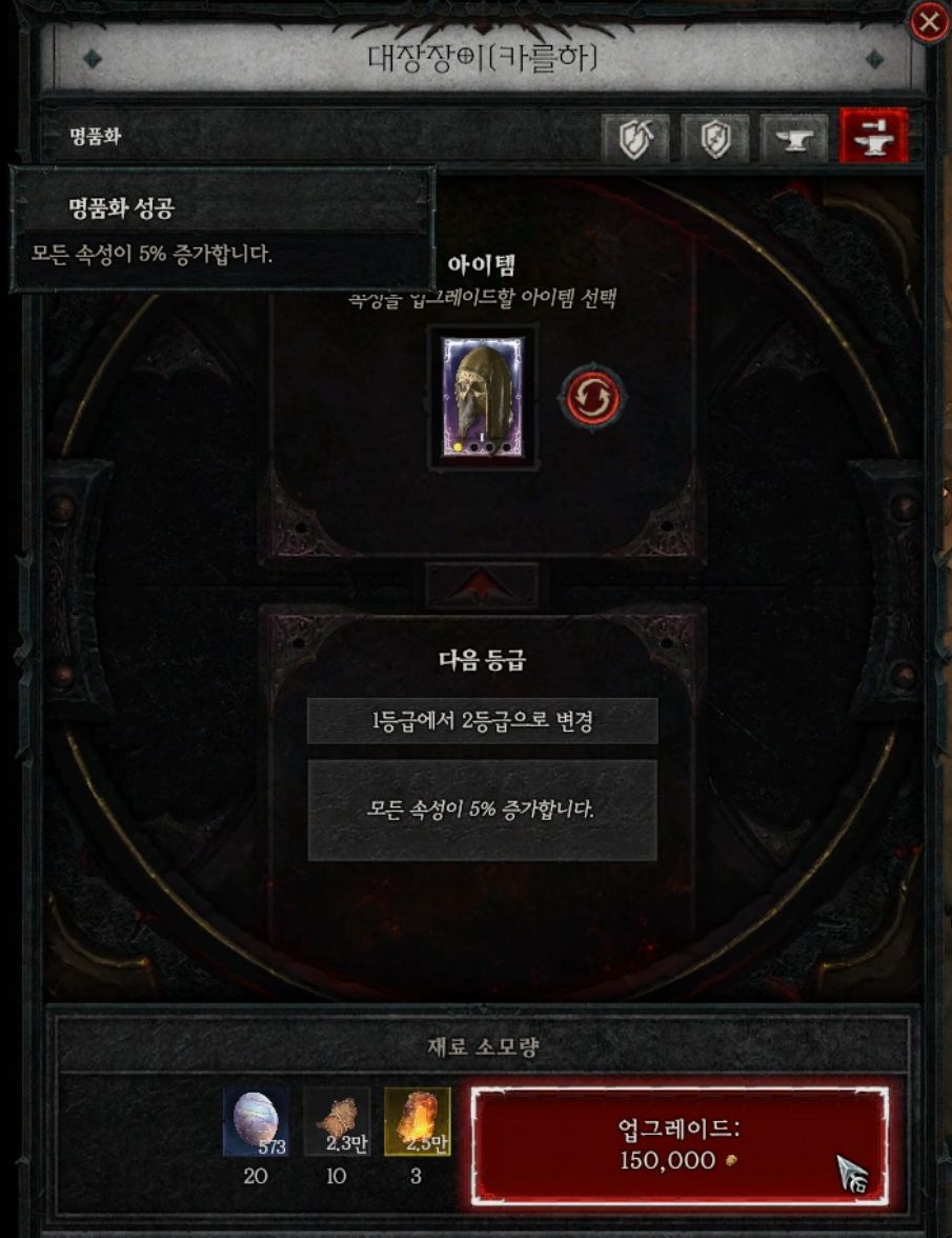 명품화를 원하는 1개 속성을 4등급+4등급+4등급=12등급으로 3단계 업그레이드 가능함.